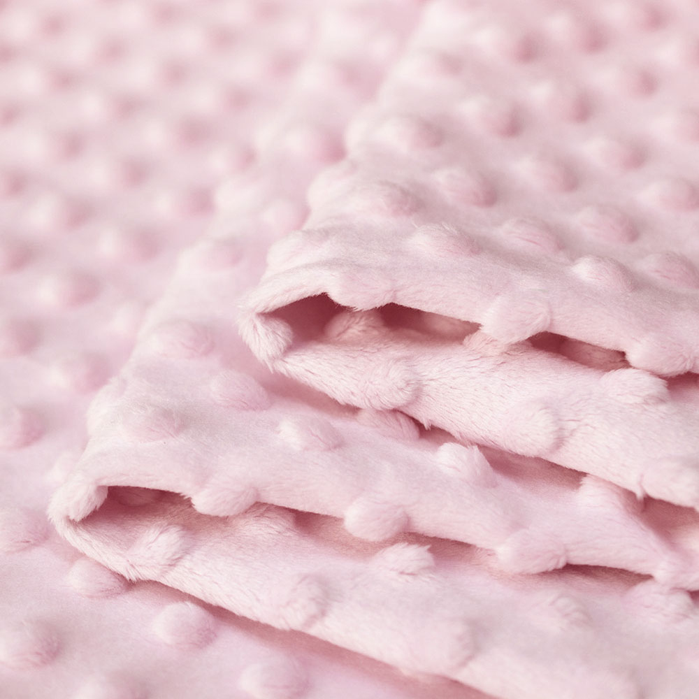 Minky Welur Kropki to bardzo popularna dzianina szczególnie wśród wyrobów dla dzieci. Dzianinę charakteryzuje krótki włos widoczny z prawej strony materiału, oraz tłoczenia w kształcie kropek, który dodaje materiałowi dużo uroku.