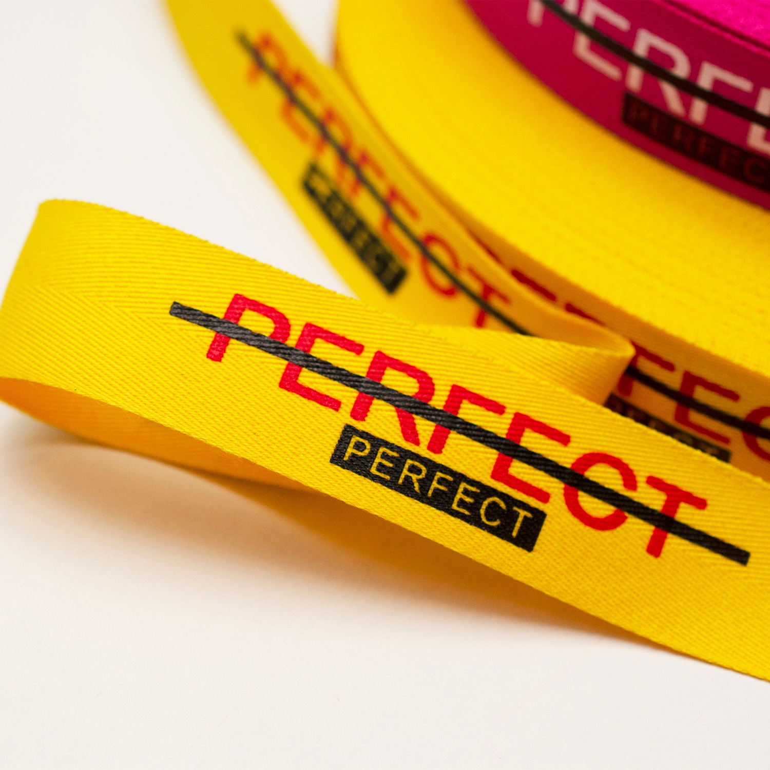 Dekoracyjna taśma w kolorze żółtym ozdobiona kolorowymi napisami. Doskonale sprawdzi się przy wykończeniach odzieży np. w postaci ozdobnych sznurków lub lampasów. Świetnie sprawdzi się także dla akcesoriów, takich jak torebki czy plecaki.