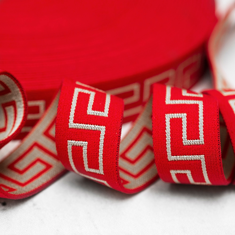 Ozdobna gumowa taśma w kolorze czerwonym, ozdobiona dodatkowo modnym wzorem w stylu greckim.