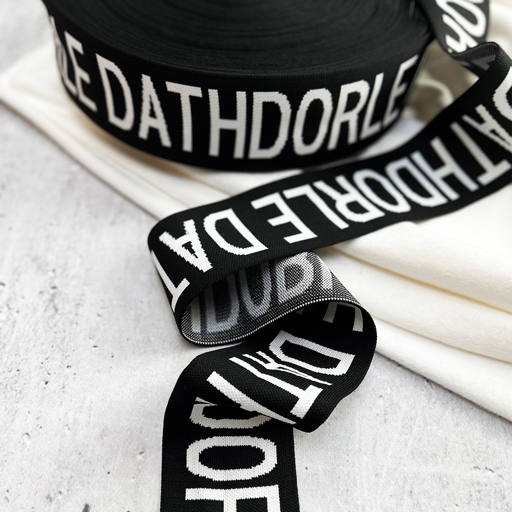 Ozdobna gumowa taśma w kolorze czarnym z modnym, białym napisem z jednej strony. Gruba warstwa tkaniny poliestrowej sprawia, że materiał ma wysoką tolerancję na wydłużanie.