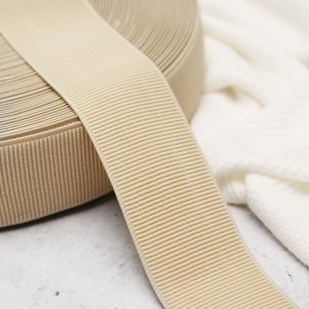 Ozdobna gumowa taśma w kolorze beżowym. Gruba warstwa tkaniny poliestrowej sprawia, że materiał ma wysoką tolerancję na wydłużanie.