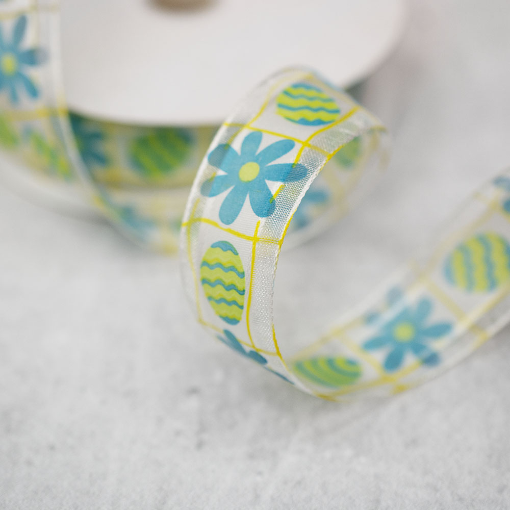 Ozdobna taśma wykonana z organzy, z motywem wielkanocnym. Świetnie sprawdzi się na różnego rodzaju dekoracje, nadając im świąteczny nastrój.