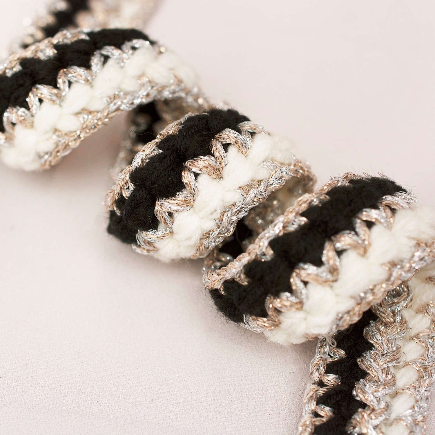 Ozdobna taśma pleciona wykonana z czarnej i kremowej włóczki oraz metalicznych nici. Doskonale sprawdzi jako element dekoracyjny uszytej odzieży i akcesoriów nadając im elegancki i wyszukany charakter. Bardzo ładnie będzie się prezentować przy wykończeniu dekoltu i rękawów, a także w formie ozdobnych lampasów.