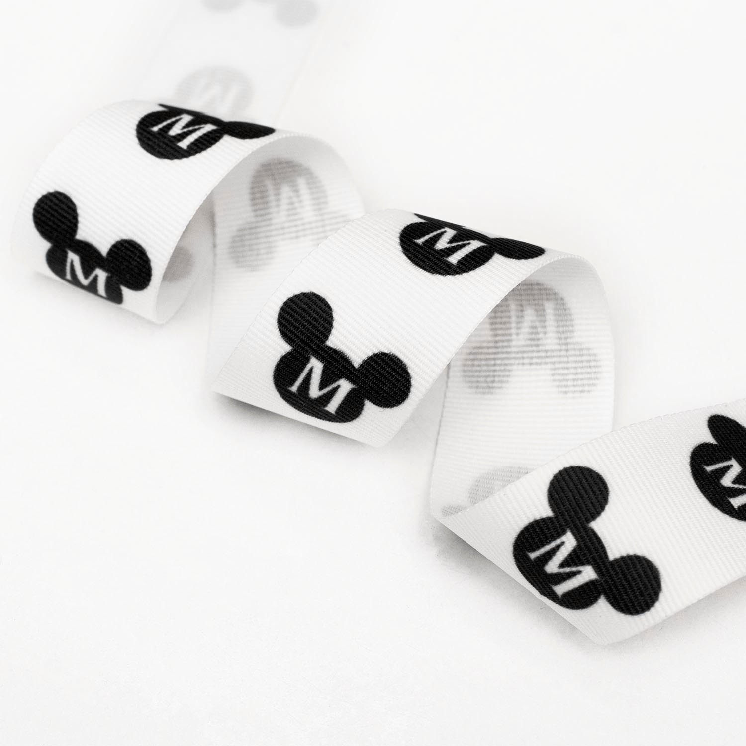 Rypsowa taśma w kolorze białym ozdobiona czarnym nadrukiem w kształcie myszki. Doskonale sprawdzi się przy wykończeniach odzieży np. w postaci ozdobnych sznurków lub lampasów. Świetnie sprawdzi się także dla akcesoriów, takich jak torebki czy plecaki.