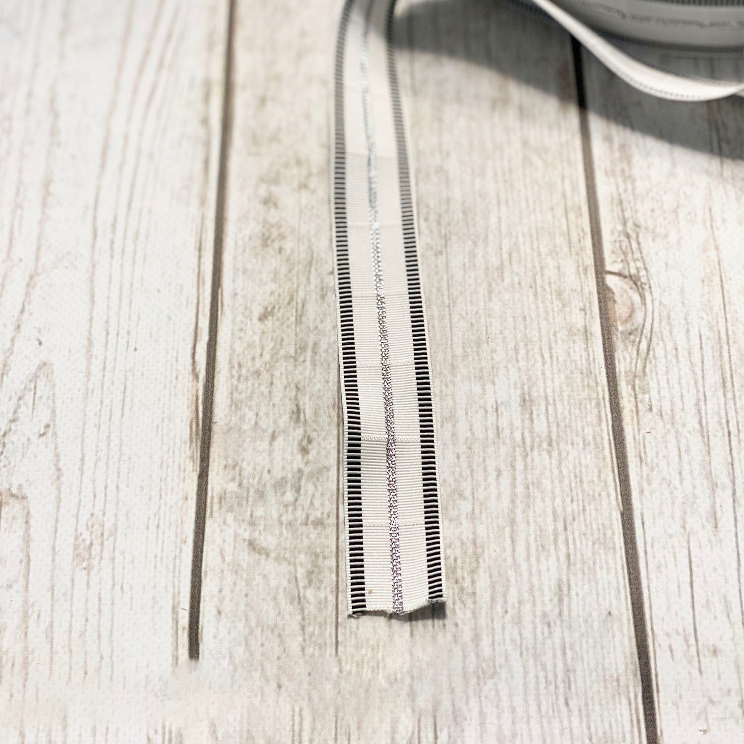 Dwukolorowa taśma rypsowa, w odcieniach bieli i czerni. Dodatkowo zdobiona metaliczną nicią. Świetnie sprawdzi się do wykończenia kreacji , np. w postaci lampasów.