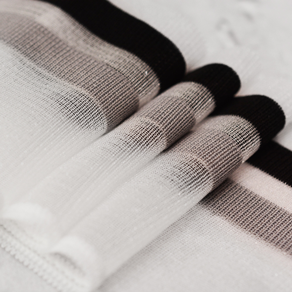 Taśma ściągaczowa wykonana z ażurowej siatki, ozdobiona paskami w odcieniach szarości i czerni. Świetnie posłuży do wykończenia bluz, spodni dresowych oraz kurtek. Obecnie taśmy ściągaczowe wykorzystywane są także przy bluzkach lub sukienkach szytych z tkanin. Nadają im bardziej sportowego charakteru, świetnie pasują do mody streetwear.