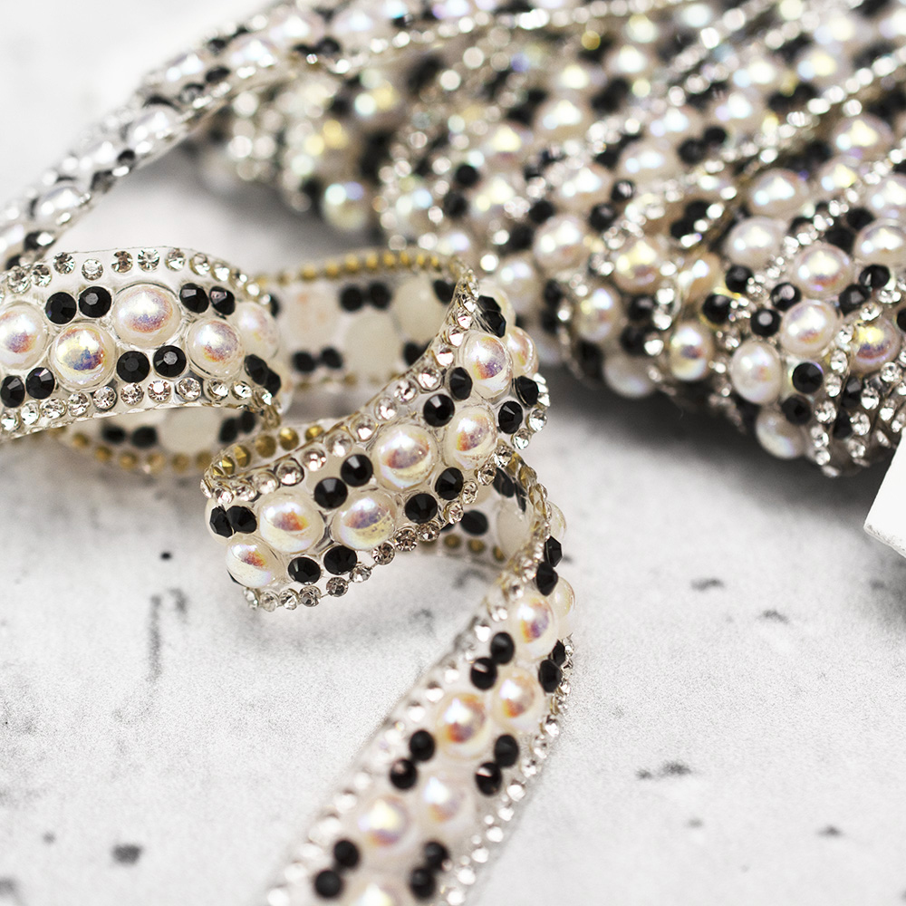 Ozdobna taśma termoaktywna z drobnymi kryształkami. Świetnie sprawdzi się przy wykańczaniu uszytej odzieży, np. przy dekolcie rękawach czy kieszeni.