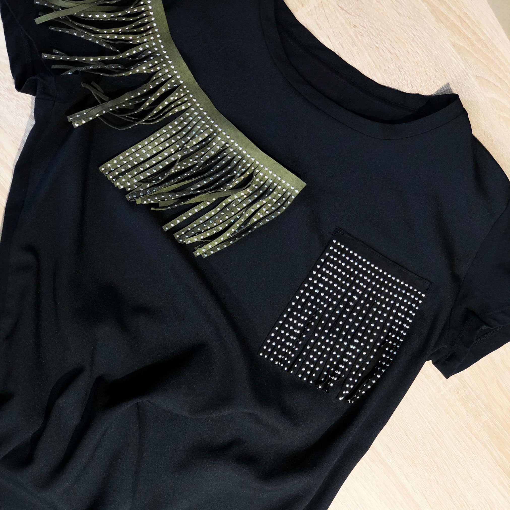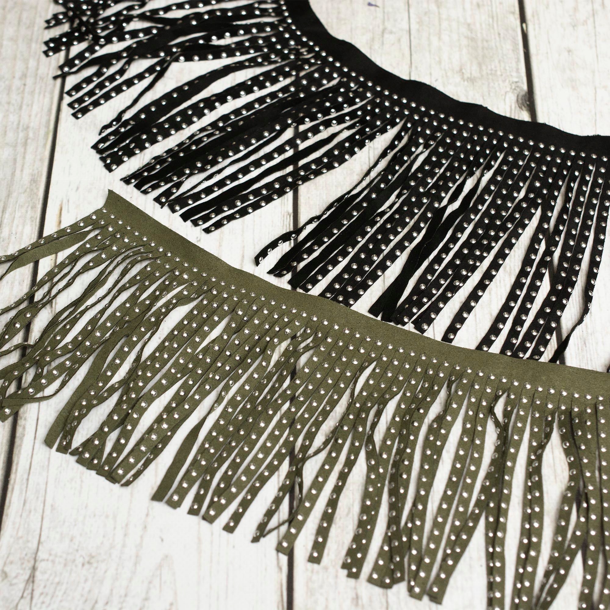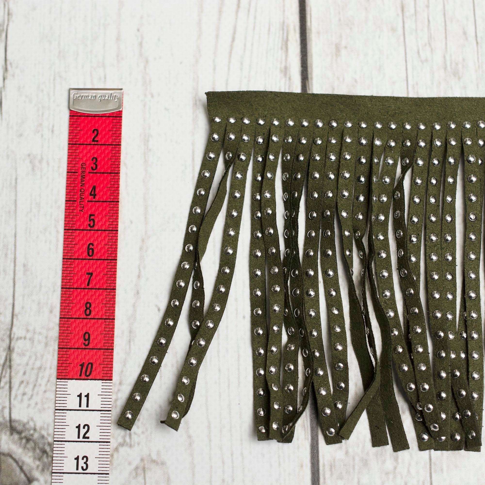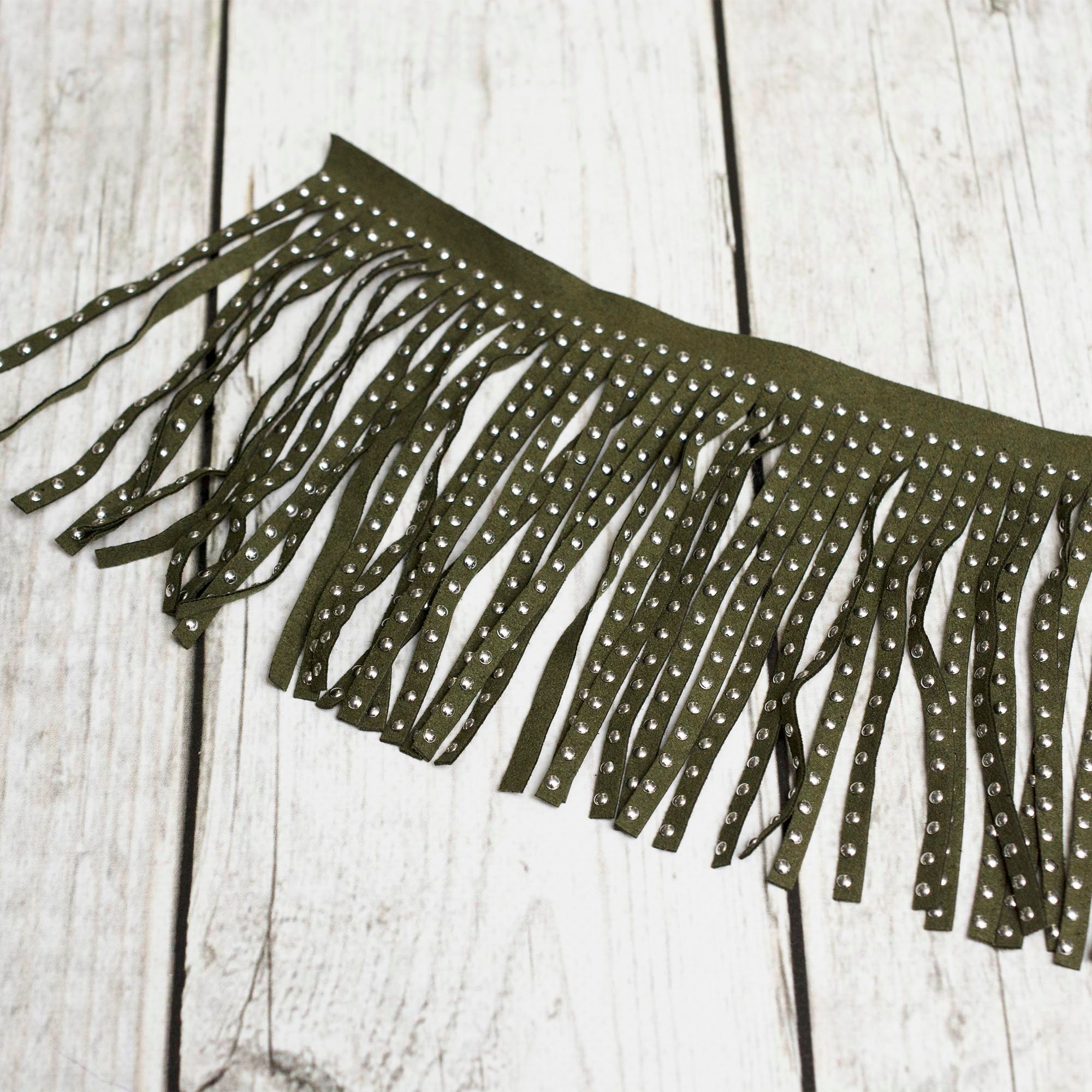 Ozdobna taśma z dekoracyjnymi frędzlami, zdobionymi dodatkowo srebrnymi ćwiekami. Wykonana z zamszopodobnego materiału w kolorze zielonym, doskonale posłuży jako element wykończeniowy do skórzanej czy jeansowej kurtki, kamizelki czy spódnicy. Także świetnie nada się w postaci modnej aplikacji, np. na t-shirt.
