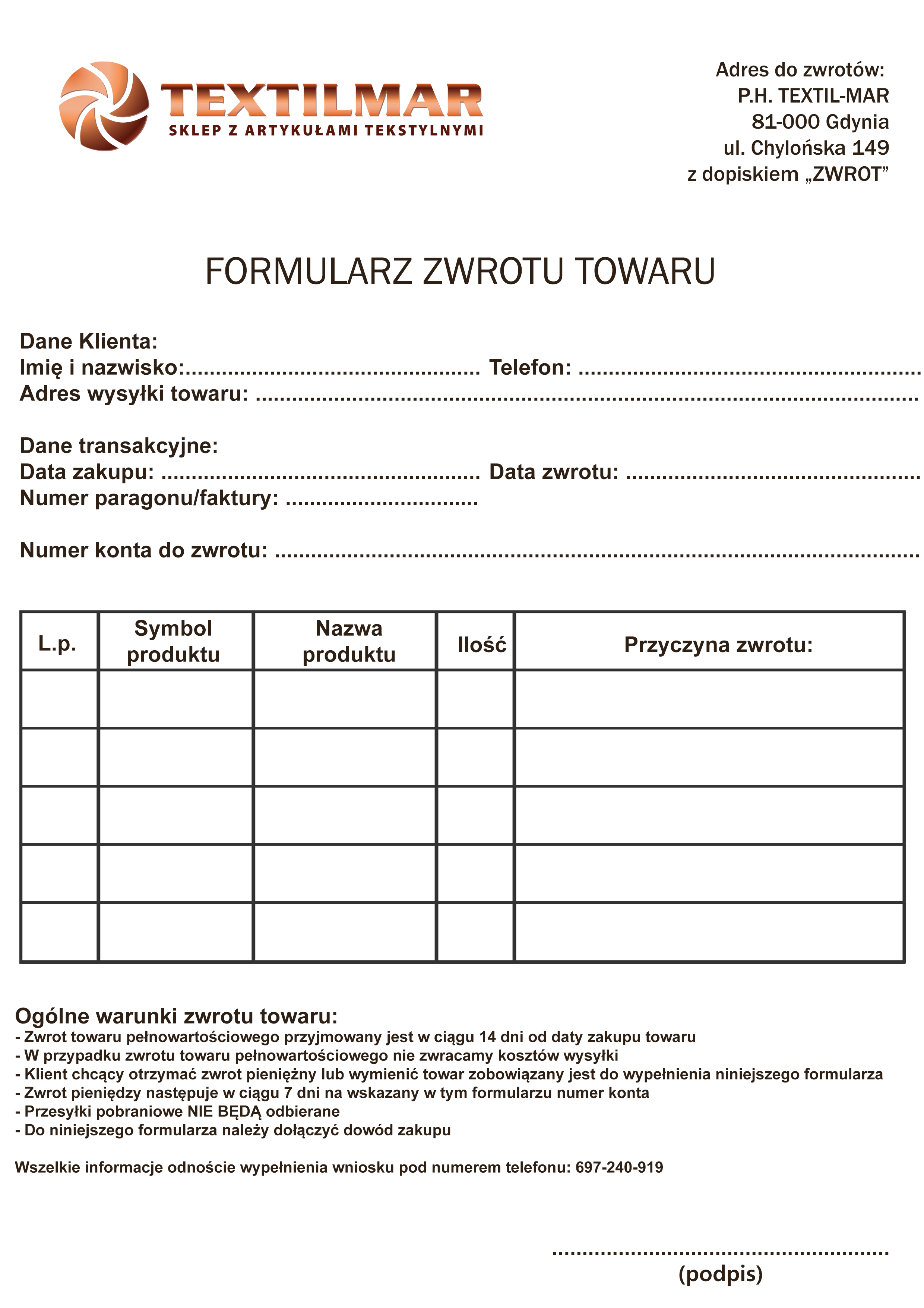 7.4 Oświadczenie o którym mowa w ust. 3 Konsument wysyła przesyłką poleconą na adres: "Marek Nawrocki Przedsiębiorstowo Handlowe TEXTIL-MAR", ul. Chylońska 149, 81-000 Gdynia z dopiskiem „ODSTĄPIENIE OD UMOWY”.