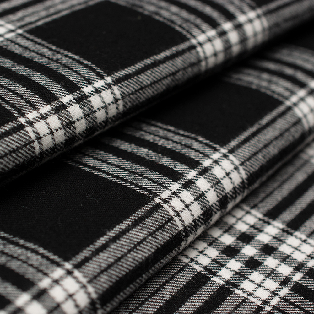 Bawełniana tkanina flanelowa o ponadczasowym i modnym wzorze kraty. Tkanina jest oddychająca, miękka w dotyku. Jej główną zaletą jest przyjemna faktura, powstała w wyniku procesu drapania. Dodatkowy atut stanowi dwustronny charakter tkaniny, w którym wzór wygląda tak samo z obu stron. Materiały tego typu świetnie wyglądają na klasycznych koszulach czy sukienkach typu szmizjerka. W tym sezonie bardzo modne są także flanelowe spódnice.