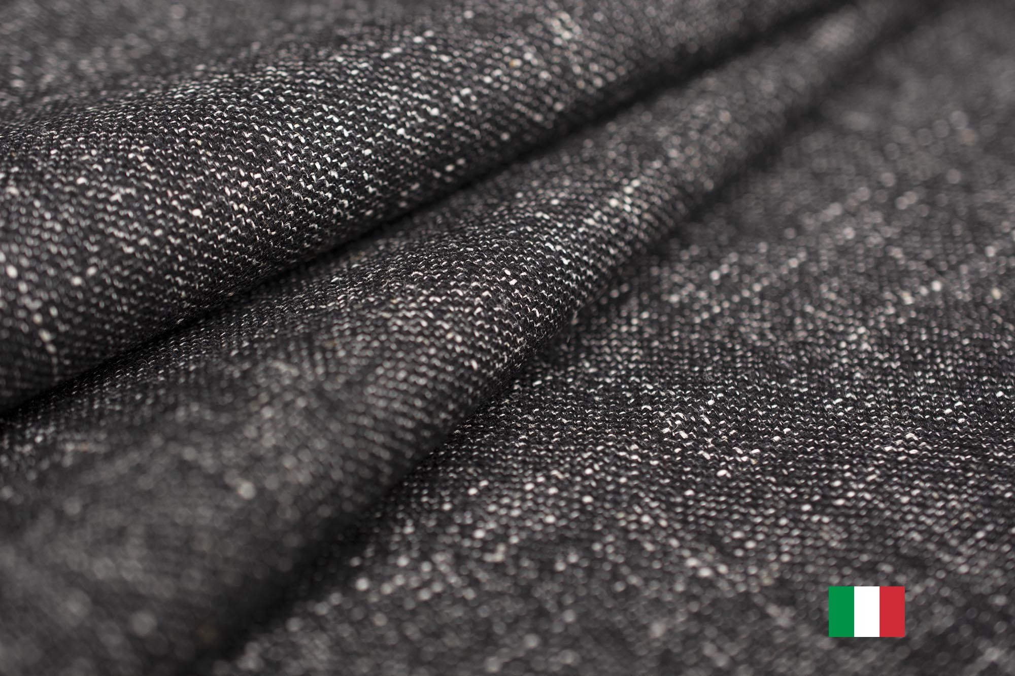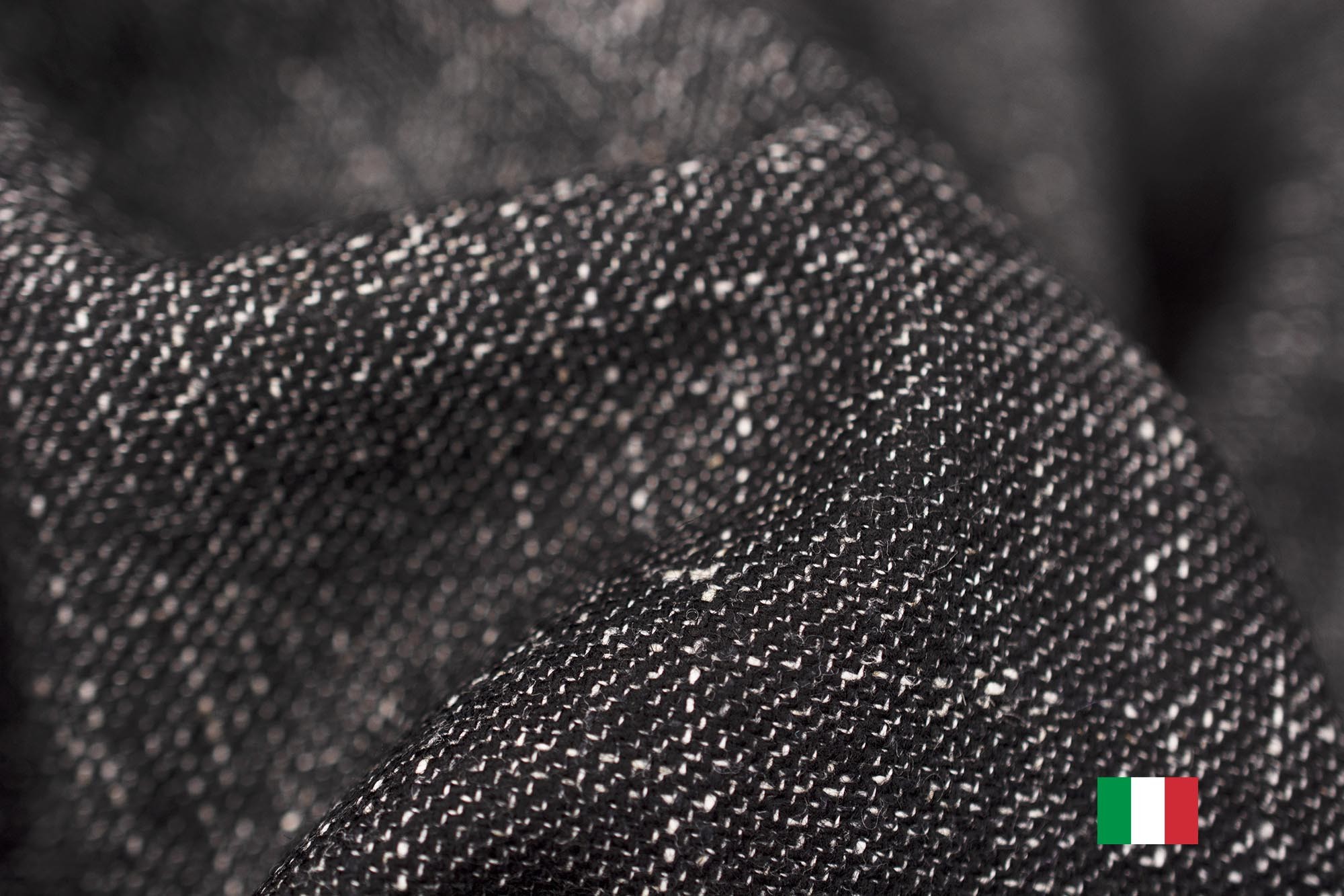 Wysokiej jakości użytkowania, włoska tkanina garniturowa o zabarwieniu czarnym. Dzięki mieszance naturalnych włókien wełny, bawełny oraz lnu, tkanina jest miękka i bardzo przyjemna w dotyku. atutem tkaniny jest wpleciona nić w kolorze ecru, która tworzy na powierzchni charakterystyczny deseń. Tkanina świetnie sprawdzi się w konfekcji męskiej. Polecamy na marynarki, garnitury czy kamizelki.