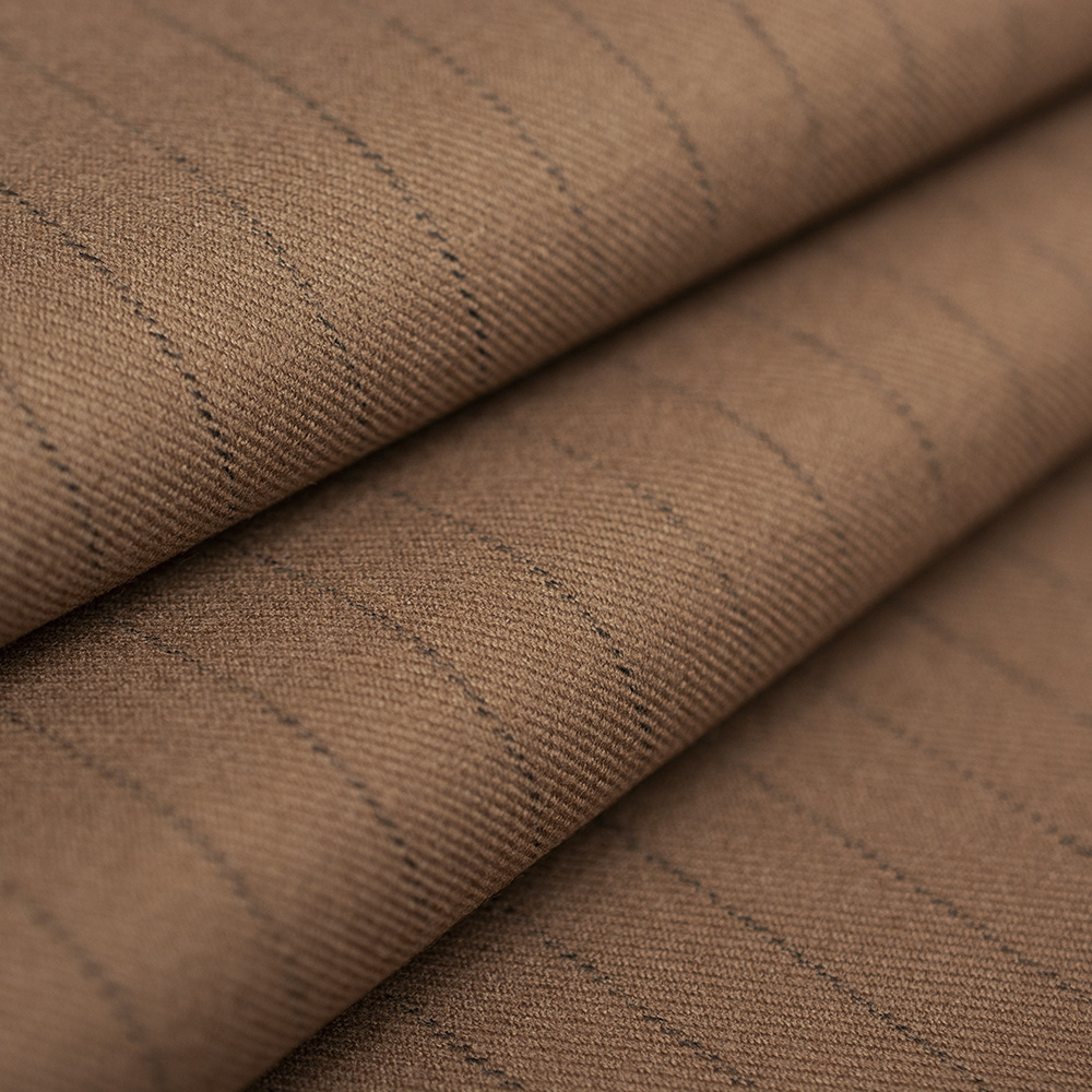 Tkanina garniturowa w jednolitym kolorze, o wzorze drobnych pasków. Bardzo dobra gatunkowo, posiada przyjemny chwyt oraz charakterystyczny, diagonalny splot. Tkanina układa się miękko, jest bardzo przyjemna w dotyku. Polecamy zarówno na elegancką konfekcję męską, jak i damską. Świetnie sprawdzi się na marynarki, garnitury czy kamizelki, a także garsonki i spódnice.
