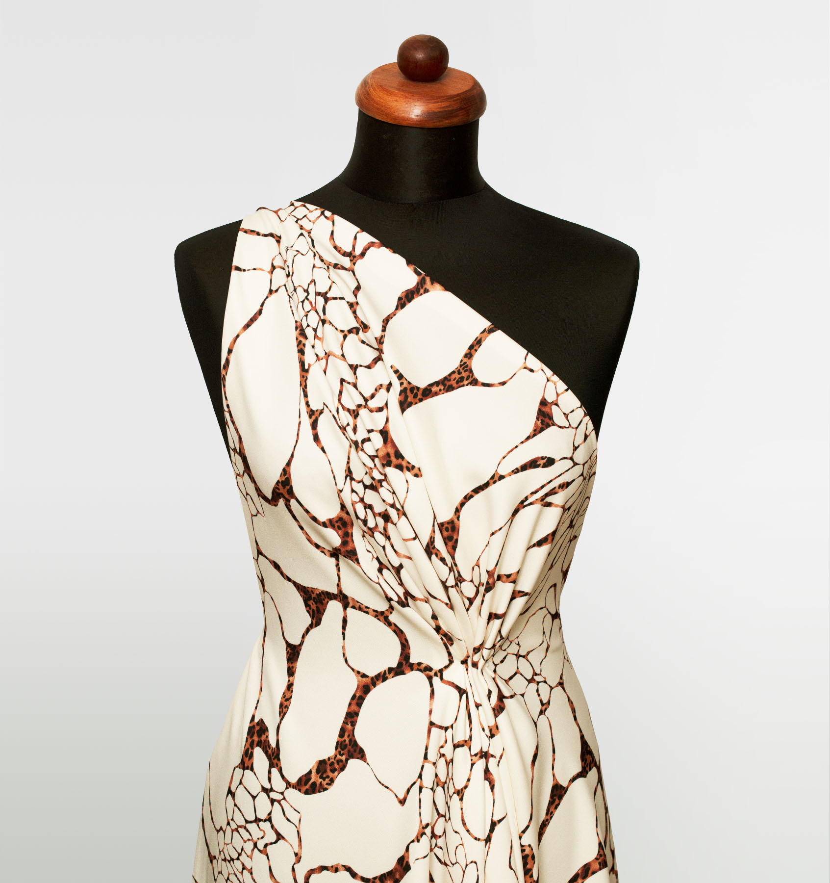 Karelia to tkanina w typie żorżety, o gładkiej fakturze. Świetnie sprawdza się na sukienki, modne wzorzyste marynarki, a także spodnie. Tkanina układa się miękko, nie gniecie się oraz nie wymaga użycia podszewki. Głównym walorem tkaniny jest piękny print wykonany za pomocą wysokiej jakości druku. Modna kolorystyka deseniu idealnie sprawdzi się przy wielu okazjach, tkaninę można nosić zarówno na co dzień, jak i rozmaite przyjęcia lub inne specjalne okazje.