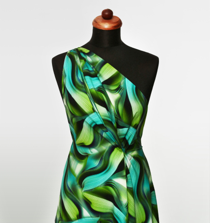 Karelia to tkanina w typie żorżety, o gładkiej fakturze. Świetnie sprawdza się na sukienki, modne wzorzyste marynarki, a także spodnie. Tkanina układa się miękko, nie gniecie się oraz nie wymaga użycia podszewki. Głównym walorem tkaniny jest piękny print wykonany za pomocą wysokiej jakości druku. Modna kolorystyka deseniu idealnie sprawdzi się przy wielu okazjach, tkaninę można nosić zarówno na co dzień, jak i rozmaite przyjęcia lub inne specjalne okazje.