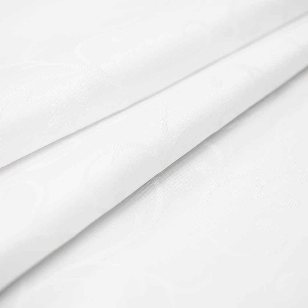 Tkanina obrusowa biała w typie żakardowym, wykonana z włókien poliestrowych. Posiada właściwości plamoodporne, jest bardzo praktyczna w codziennym użytkowaniu. Tkaniny tego typu często wykorzystywane są do zastosowań komercyjnych.Dodatkowym atutem tkaniny jest wzór przypominającym kratkę w stylu melanżowym.