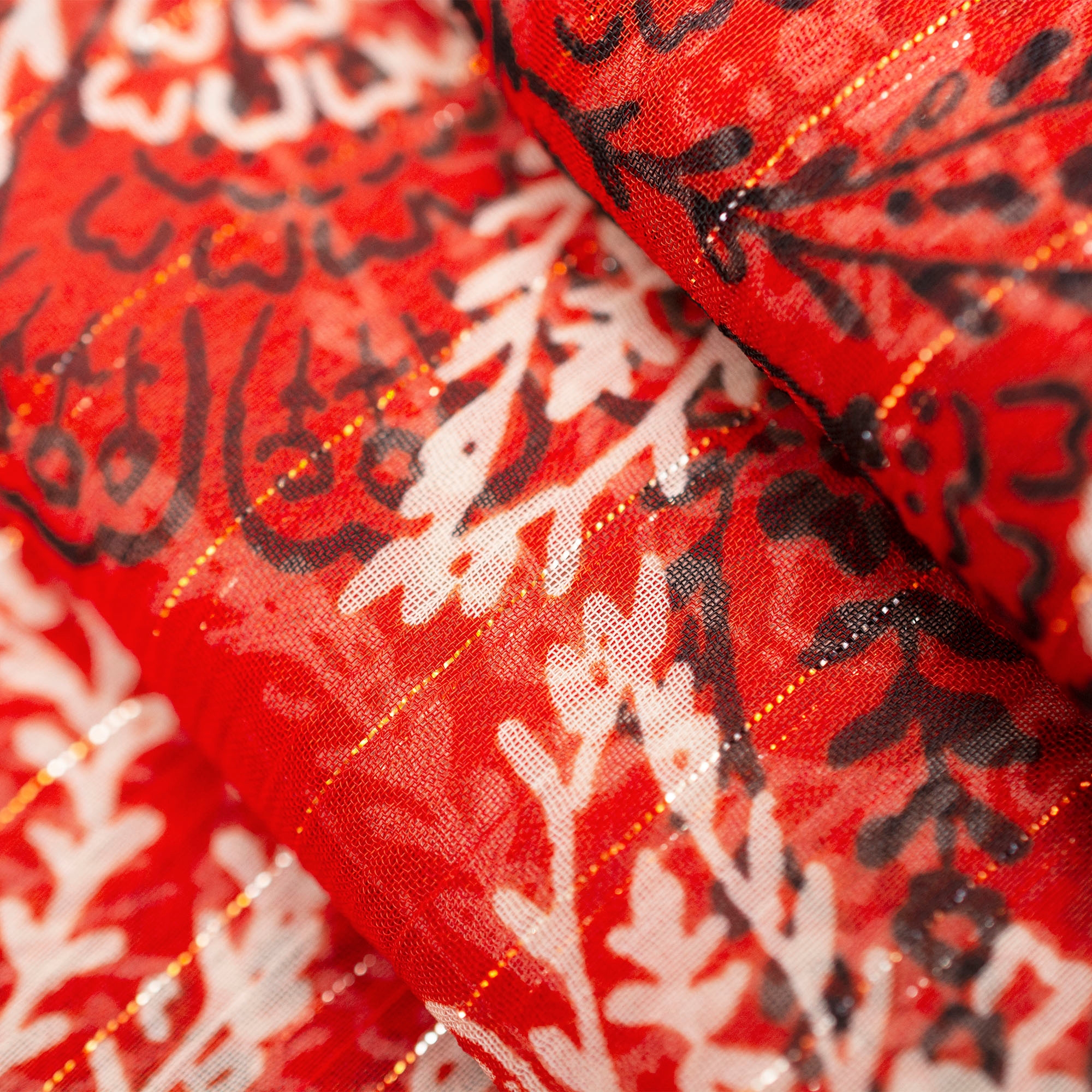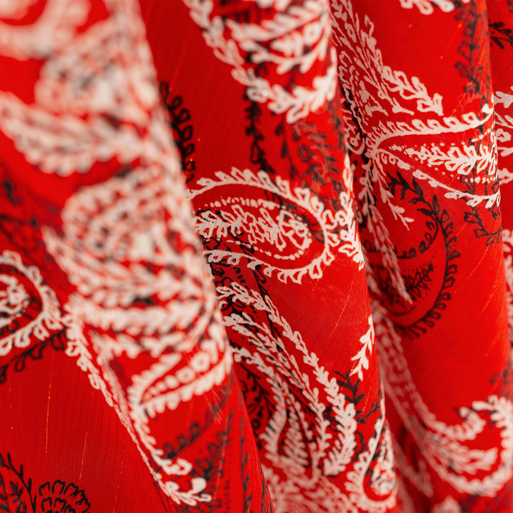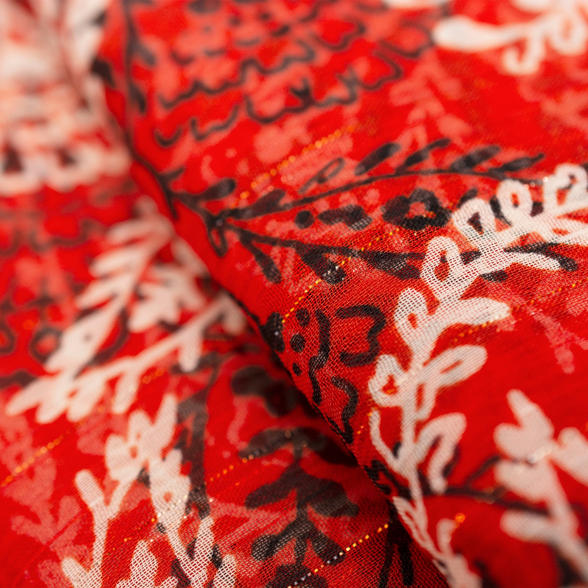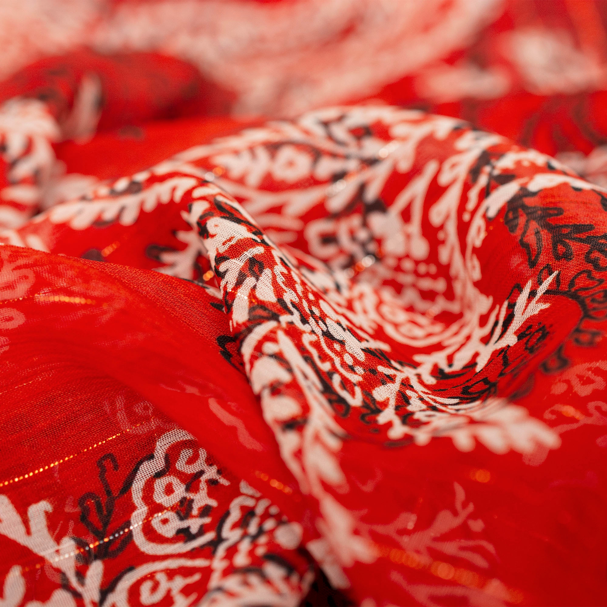 Delikatna tkanina szyfonowa o splocie żorżetowym. Wykonana z wysokiej jakości włókien, jest bardzo przyjemna w dotyku, posiada delikatny, jedwabisty chwyt. Tkanina układa się miękko oraz lejąco, ze względu na swoją transparentność tkanina wymaga dodatkowego podszycia. Szyfon wyróżnia się oryginalną fakturą i pięknym wzorem. Kwiaty doskonale komponują się z błękitnym tłem nadając całości lekkości i zwiewności.