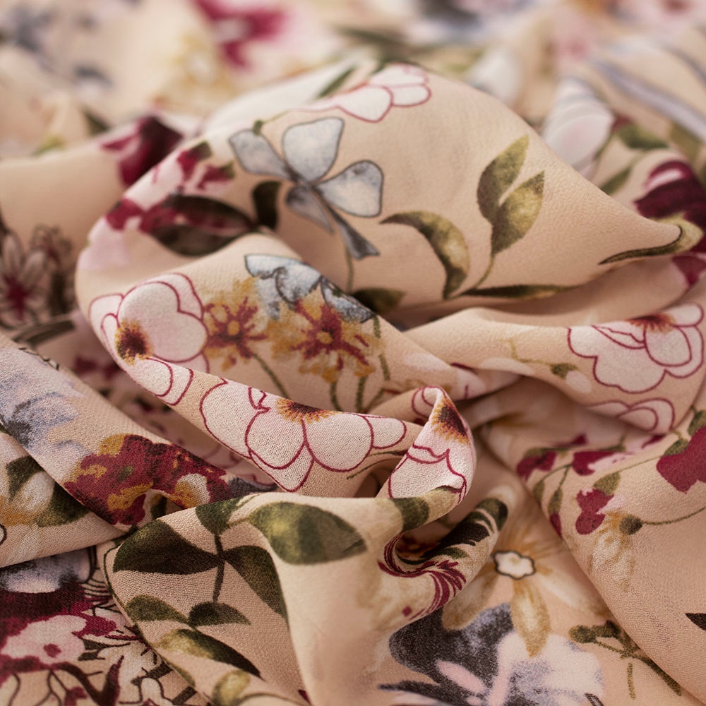 Delikatna tkanina szyfonowa o bardzo przyjemnej w dotyku fakturze. Jest lekka, układa się zwiewnie, miękko opływa ciało. Ze względu na swoją transparentność tkanina wymaga dodatkowego podszycia. Szyfon wyróżnia się pięknym i oryginalnym wzorem. Kwiatowe motywy idealnie wpisują się w aktualne trendy modowe. Deseń świetnie się sprawdzi zarówno w noszeniu na co dzień, jak i na specjalne okazje.