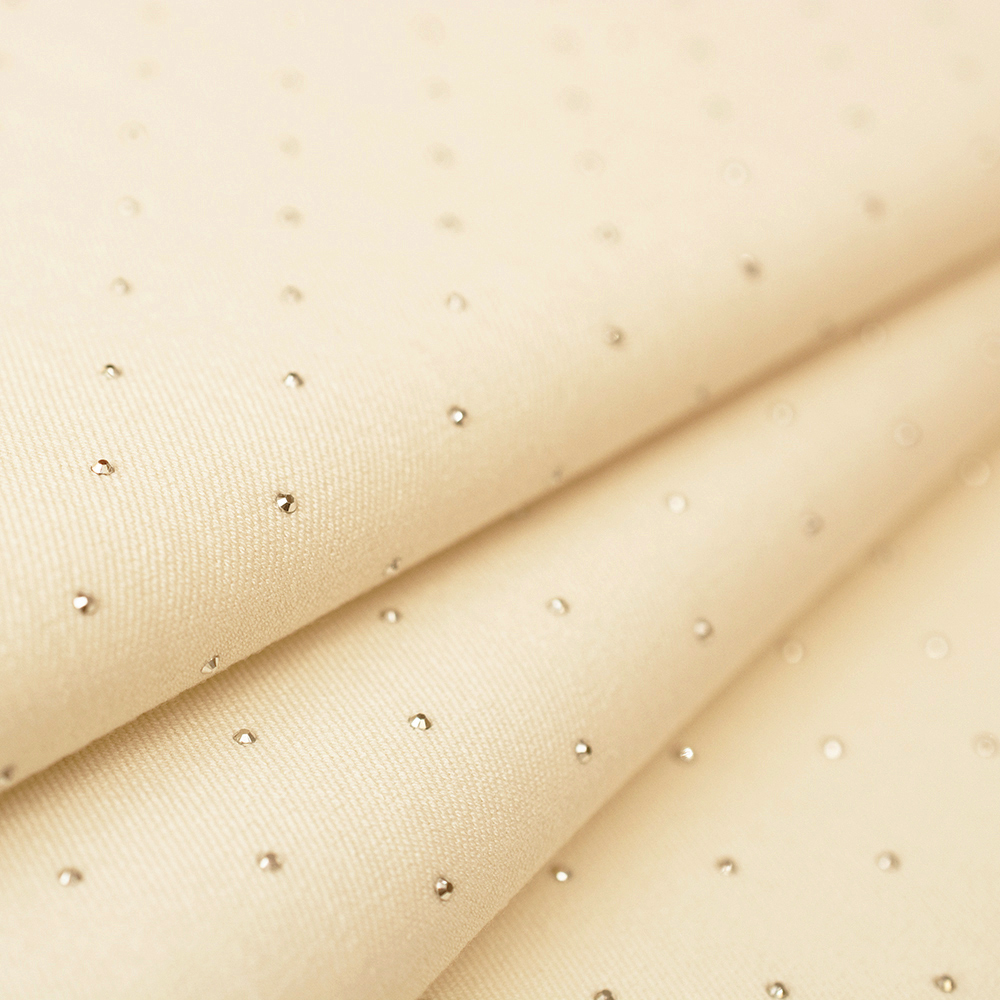 Tkanina Versace Jet to elegancka tkanina ubraniowa o diagonalnym splocie, ozdobiona drobnymi, czarnymi cyrkoniami. Wykonana z włókien wiskozy oraz syntetycznych, jest miękka i przyjemna w dotyku, bardzo ładnie prezentuje się na sylwetce. Dodatek elastanu sprawia, że tkanina jest bardzo wygodna w noszeniu.