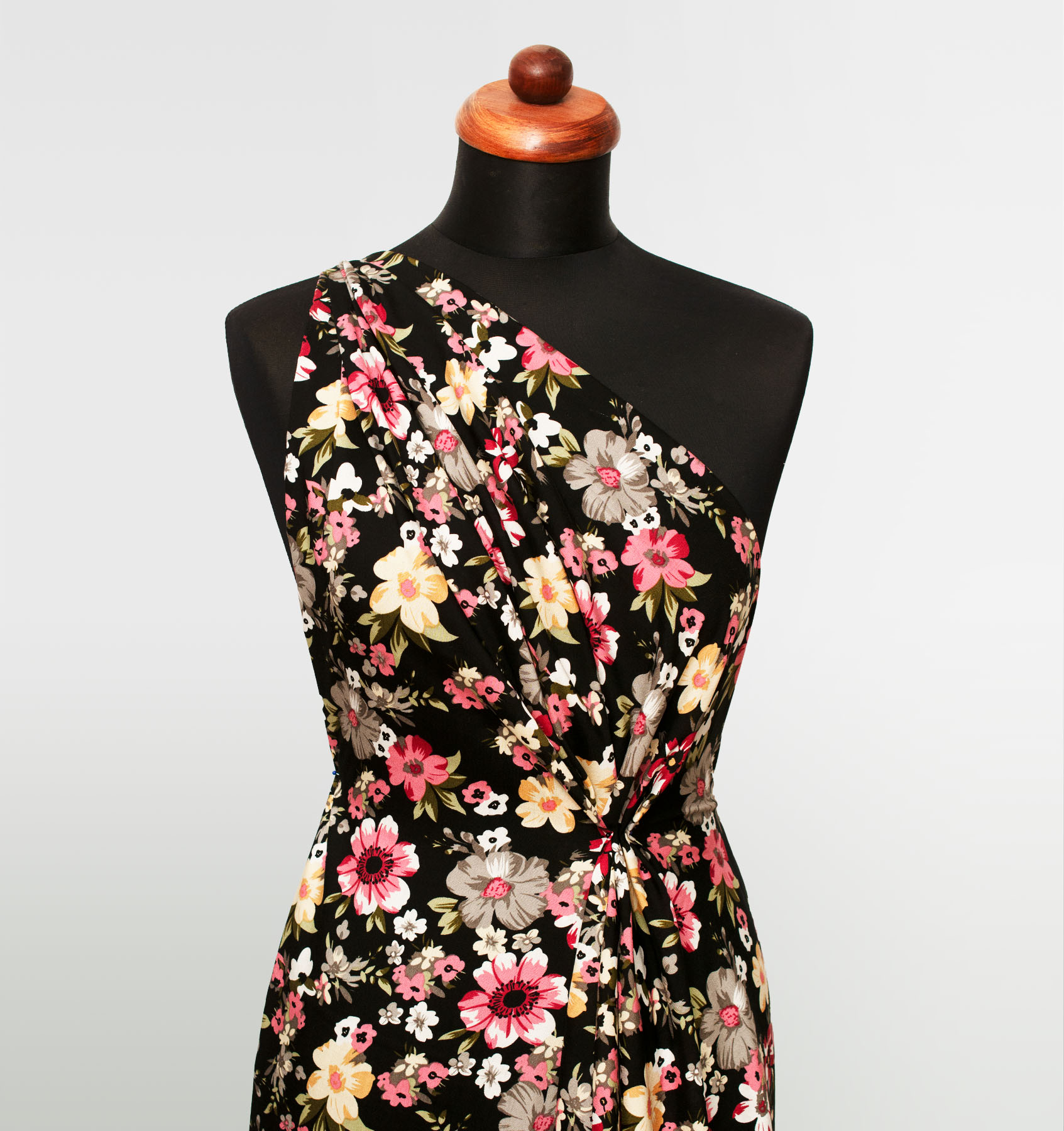 Wzorzysta tkanina wiskozowa, idealna na sukienki, spódnice i bluzki. Wykonana z włókien naturalnego pochodzenia, charakteryzuje się świetną przepuszczalnością powietrza. Jest lekka, zwiewna, układa się miękko i lejąco. Ze względu na swoje właściwości tkaniny tego typu świetnie nadają się na luźniejsze lub rozkloszowane fasony, bardzo ładnie prezentują się przy falbanach lub marszczeniach.