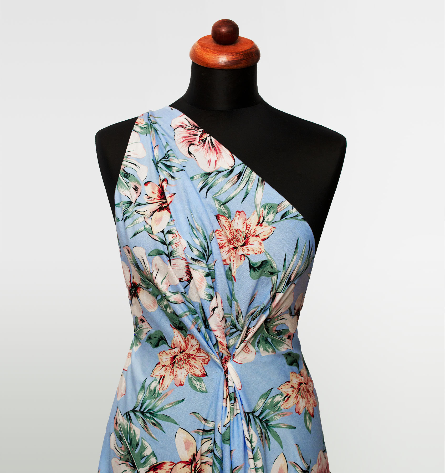 Wzorzysta tkanina wiskozowa, idealna na sukienki, spódnice i bluzki. Wykonana z włókien naturalnego pochodzenia, charakteryzuje się świetną przepuszczalnością powietrza. Jest lekka, zwiewna, układa się miękko i lejąco. Ze względu na swoje właściwości tkaniny tego typu świetnie nadają się na luźniejsze lub rozkloszowane fasony, bardzo ładnie prezentują się przy falbanach lub marszczeniach.