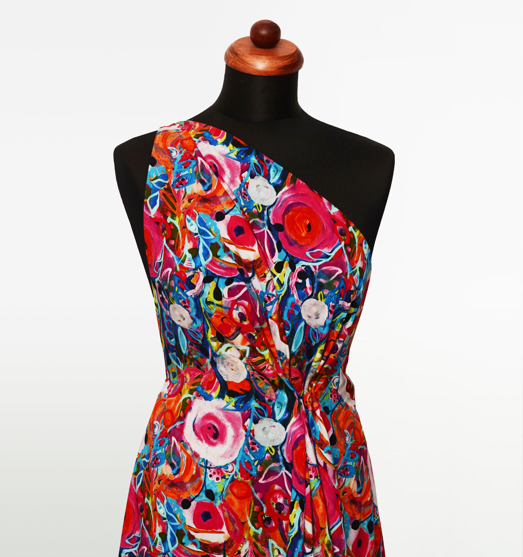 Wzorzysta tkanina wiskozowa, idealna na sukienki, spódnice i bluzki. Wykonana z włókien naturalnego pochodzenia, charakteryzuje się świetną przepuszczalnością powietrza. Jest lekka, zwiewna, układa się miękko i lejąco. Ze względu na swoje właściwości tkaniny tego typu świetnie nadają się na luźniejsze lub rozkloszowane fasony, bardzo ładnie prezentują się przy falbanach lub marszczeniach.