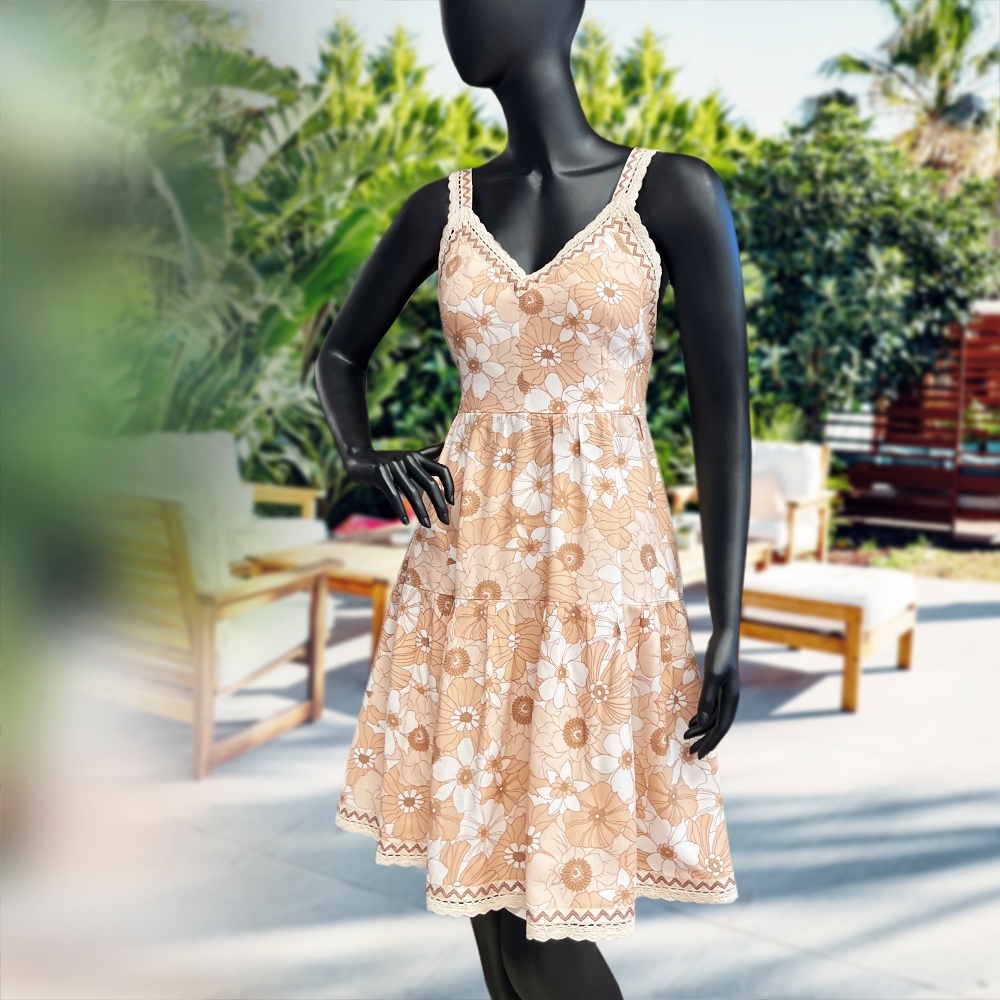 Wzorzysta tkanina wiskozowa, idealna na sukienki, spódnice i bluzki. Wykonana z włókien naturalnego pochodzenia, charakteryzuje się świetną przepuszczalnością powietrza. Jest lekka, zwiewna, układa się miękko i lejąco. Ze względu na swoje właściwości tkaniny tego typu świetnie nadają się na luźniejsze lub rozkloszowane fasony, bardzo ładnie prezentują się przy falbanach lub marszczeniach. Uszyte kreacje dopełni modny wzór z motywem kwiatowym. Deseń świetnie sprawdzi się dla codziennych stylizacji na wiosnę i lato.