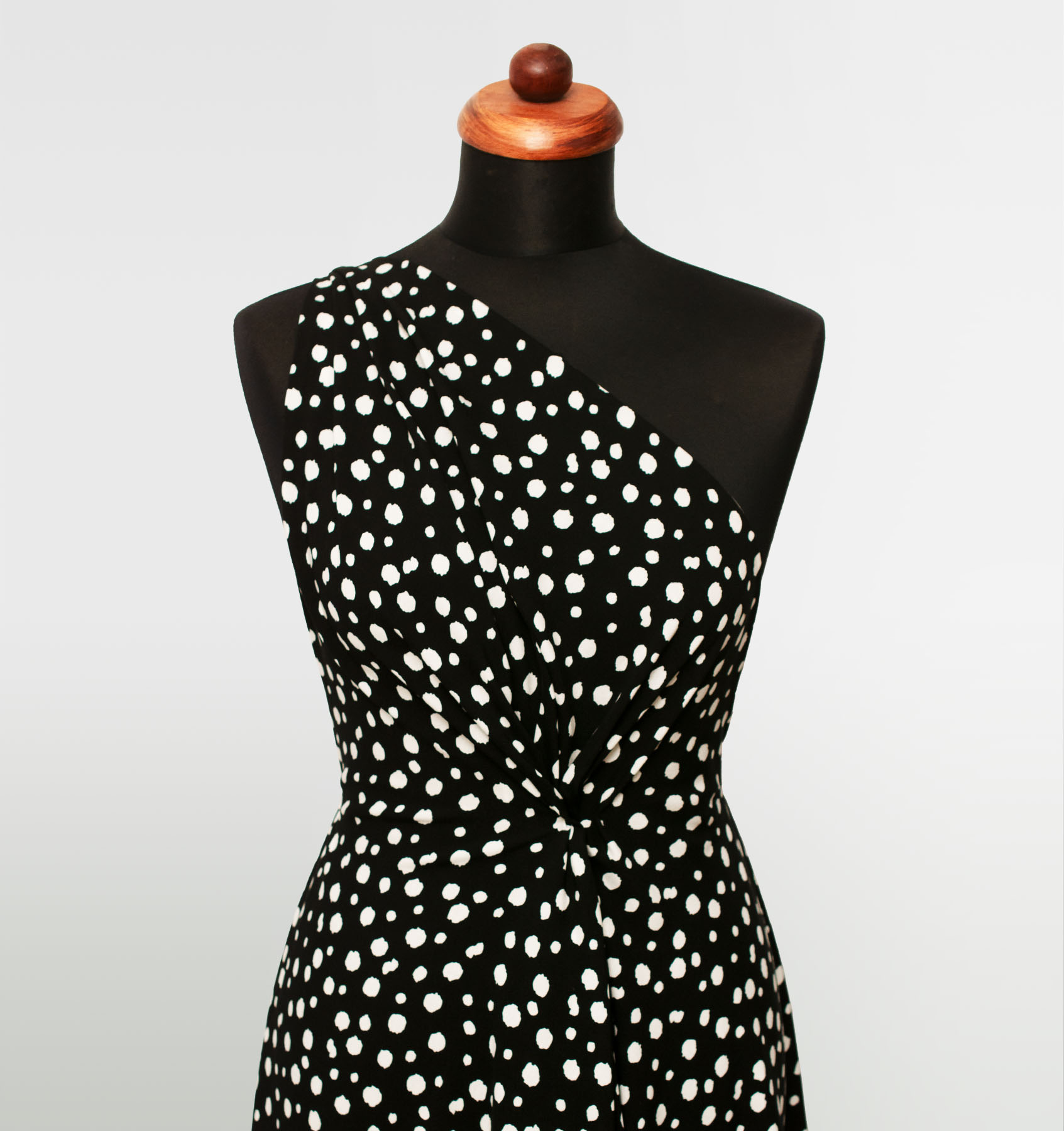 Wzorzysta tkanina wiskozowa, idealna na sukienki, spódnice i bluzki. Wykonana z włókien naturalnego pochodzenia, charakteryzuje się świetną przepuszczalnością powietrza. Jest lekka, zwiewna, układa się miękko i lejąco. Ze względu na swoje właściwości tkaniny tego typu świetnie nadają się na luźniejsze lub rozkloszowane fasony, bardzo ładnie prezentują się przy falbanach lub marszczeniach.