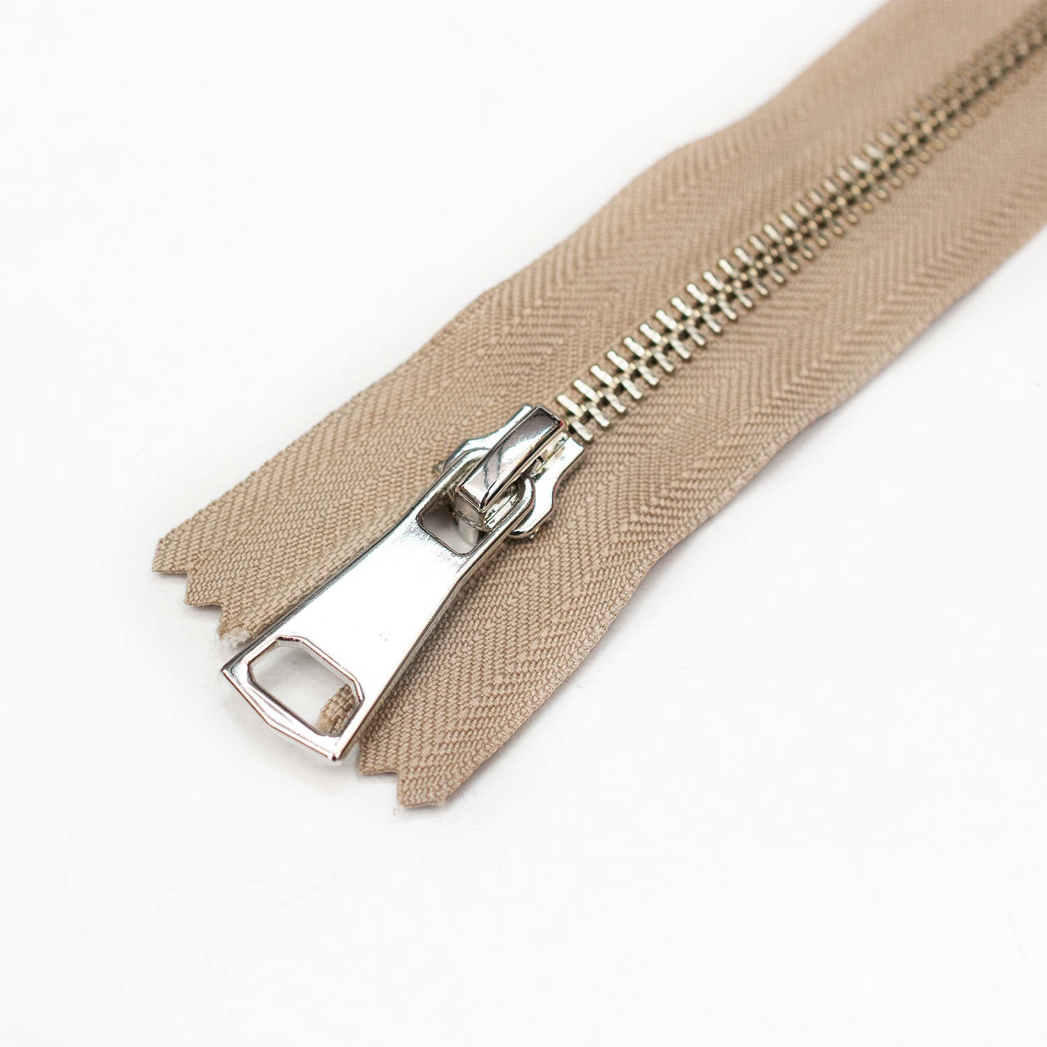 Metalowy zamek o długości 14 cm. Wykonany z bawełnianej taśmy oraz metalowych ząbków o szerokości 0,6 cm. Doskonale sprawdzi się przy wykończeniu bluz oraz kurtek.